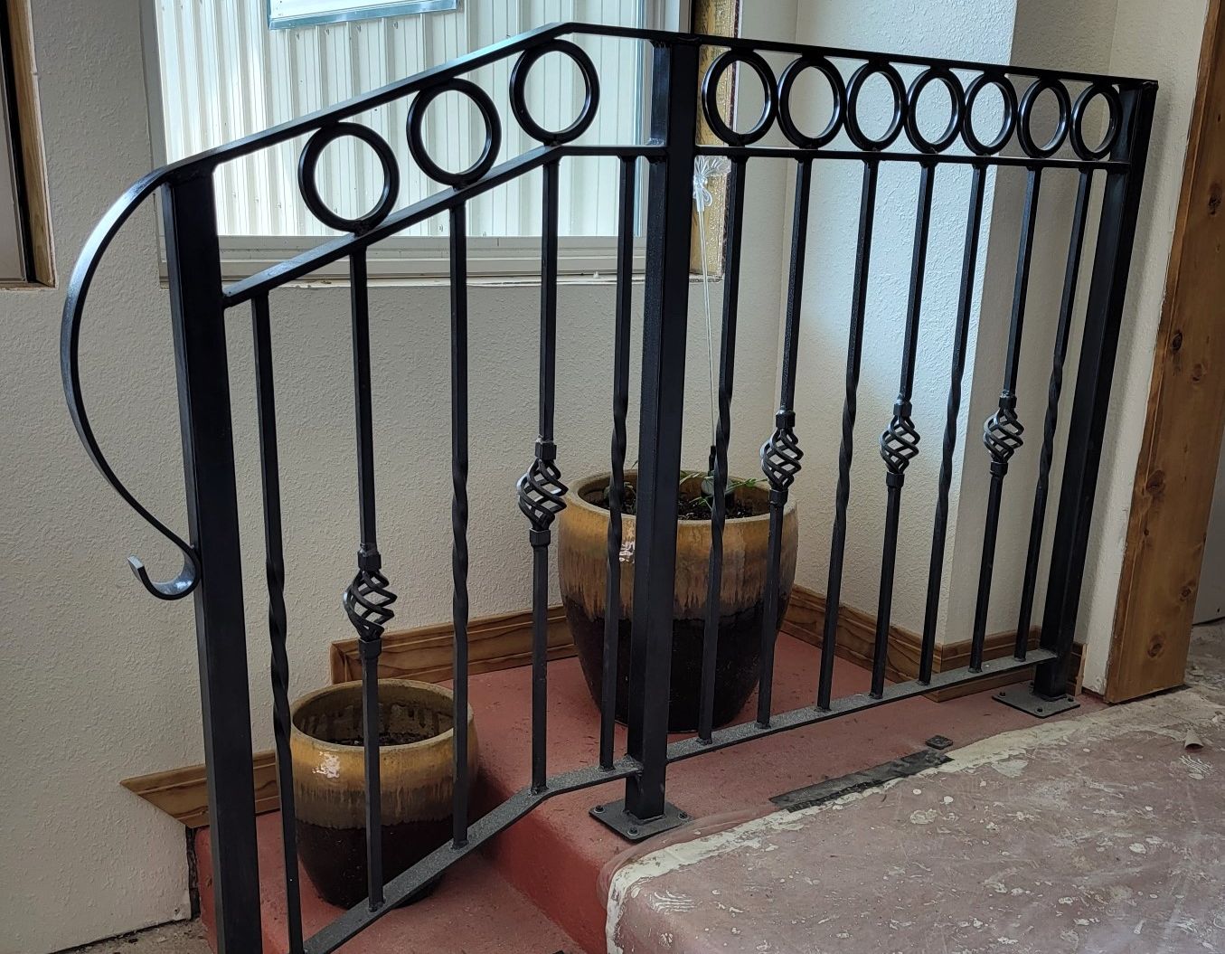 Handrail is made with 1 1/2" x 1/2" Top Rail to meet 4" circumference code. 1/2" Solid Pickets are spaced 4" on Centers to meet 4" space code. Every other picket is twisted and every other picket has a basket. Height and other details to be worked out by customer.