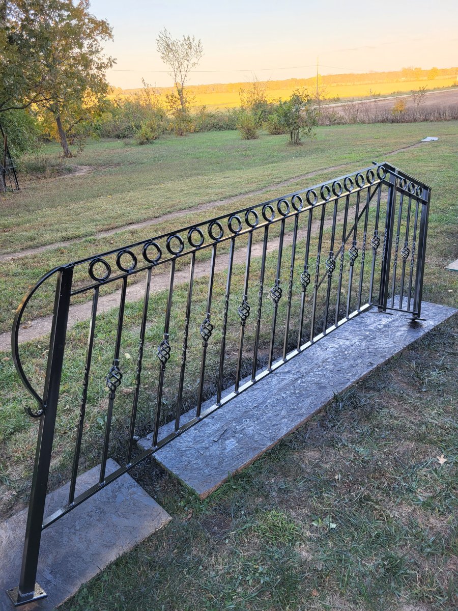 Handrail is made with 1 1/2" x 1/2" Top Rail to meet 4" circumference code. 1/2" Solid Pickets are spaced 4" on Centers to meet 4" space code. Every other picket is twisted and every other picket has a basket. Height and other details to be worked out by customer.
